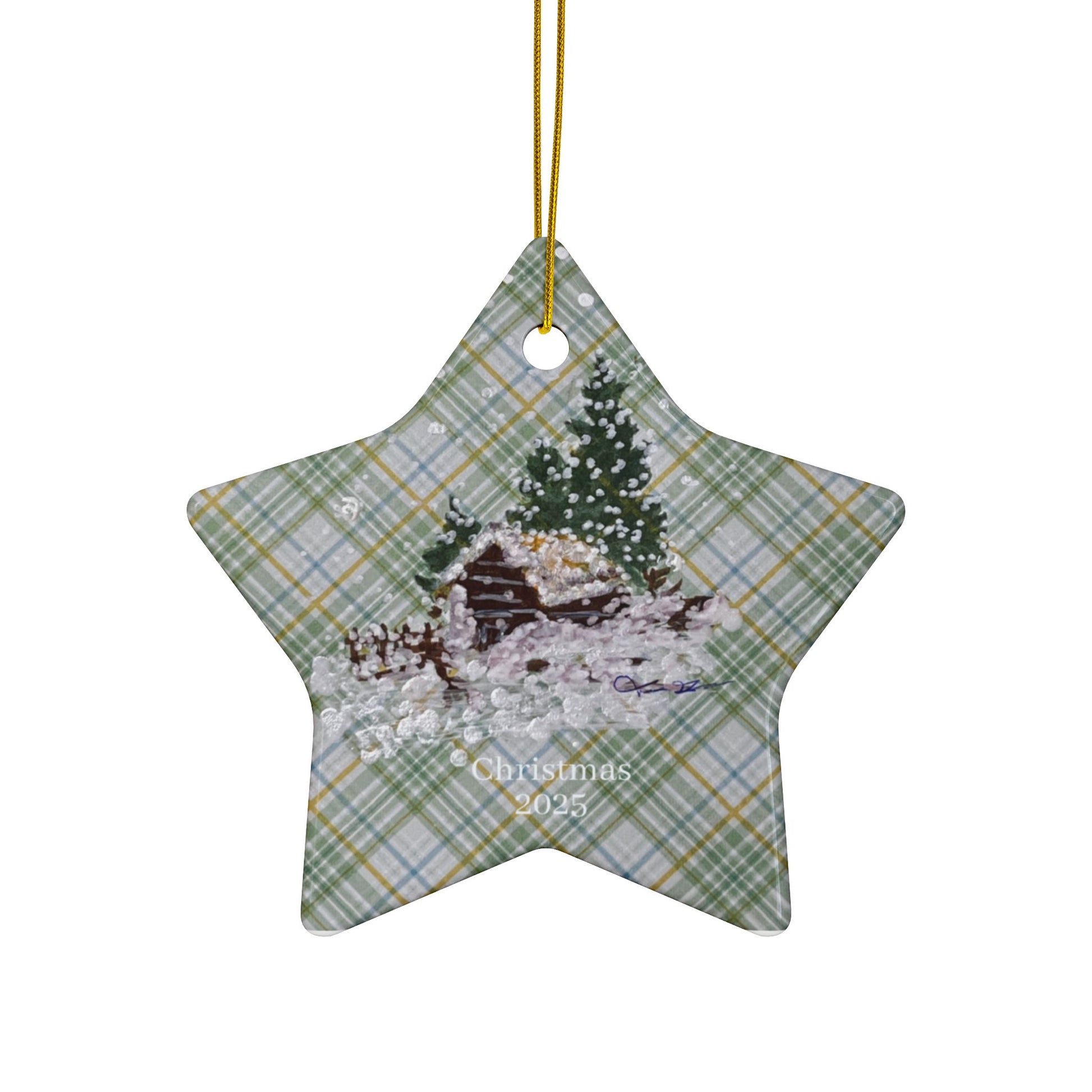 Plaid Cottage Christmas ornament featuring a print of an artist-made original Christmas tree design. Perfect for adding a festive touch to your holiday decor and creating lasting memories. Ideal for collectors and anyone looking to enhance their Christmas celebrations.